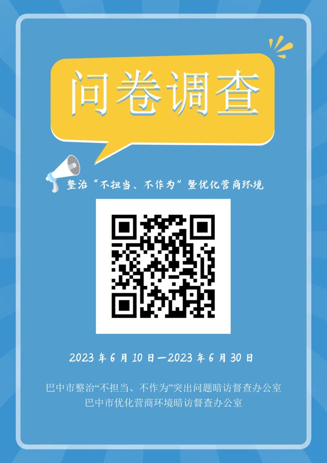 為深入整治“不擔(dān)當(dāng)、不作為”突出問題,更好地了解全面從嚴(yán)治黨、決策部署落實(shí)、優(yōu)化營商環(huán)境、推動鄉(xiāng)村振興、保障民生改善、防范化解風(fēng)險(xiǎn)等方面的情況,以及廣大干部群眾和企業(yè)對干事創(chuàng)業(yè)環(huán)境的切身感受,按照市委、市政府工作安排,巴中市整治“不擔(dān)當(dāng)、不作為”突出問題暗訪督查辦公室、巴中市優(yōu)化營商環(huán)境暗訪督查辦公室決定開展整治“不擔(dān)當(dāng)、不作為”突出問題暨優(yōu)化營商環(huán)境網(wǎng)絡(luò)問卷調(diào)查,調(diào)查時間為2023年6月10日至6月30日。